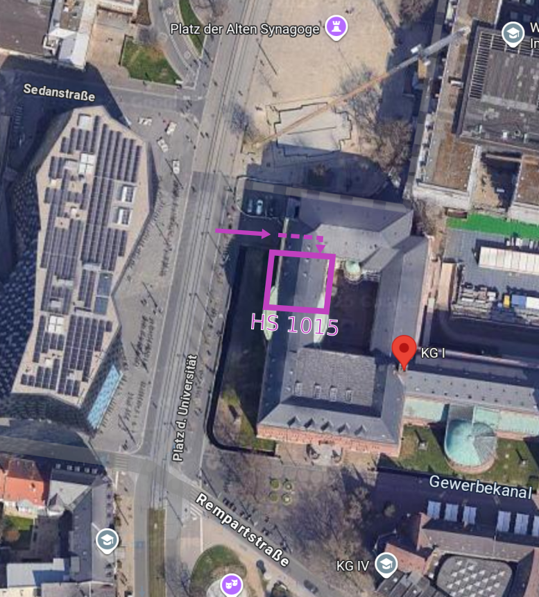 Location: HS 1015, KG I, Platz der Universität 3, 79098 Freiburg (sketch, gmaps link).